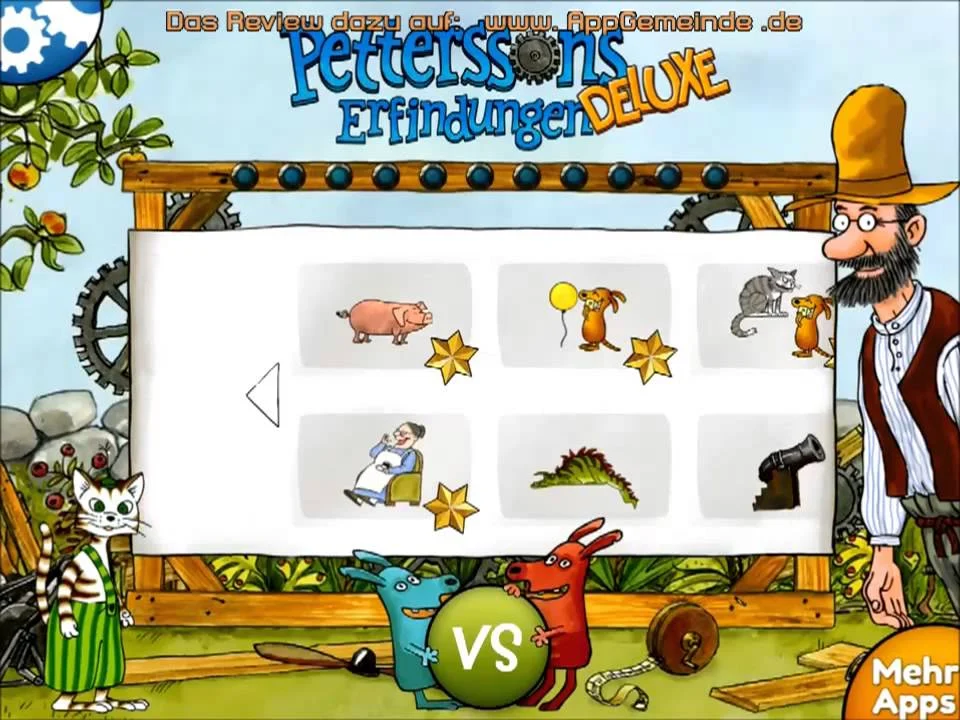Kinder lieben den schrulligen alten Herrn namens Pettersson, der sein Haus mit dem jungen Kater Findus teilt. Die Kinderbücher von Sven Nordqvist waren vor allem auf Grund der lustigen Konstellation und den schönen Illustrationen des Autors bei Groß und Klein beliebt. Nun können Kinder mit Petterssons Erfindungen Deluxe altersgerecht auf dem iPad rätseln. Die jetzt erschienene Deluxe Version enthält alle Rätsel aus Teil 1 und 2 und ein paar neue Erfindungen, womit man hier 66 Level bekommt.