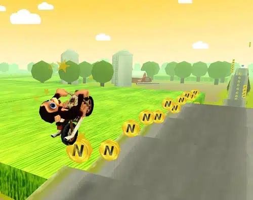 Mit einem Schimpansen geht es auf motorisiertem Untersatz auf einer endlosen geraden Straße in den Sonnenuntergang. Auf der road to nowhere finden sich jede Menge Münzen und PowerUps, die man natürlich einsammeln muss. Dafür lassen sich Store dann entweder praktische Item und PowerUps erwerben, wer möchte kann aber auch das Moped oder den Affe stylen. Die Straße ist dabei recht hügelig und bietet große Schanzen, von den sich Stunts und Salti ausführen lassen.
