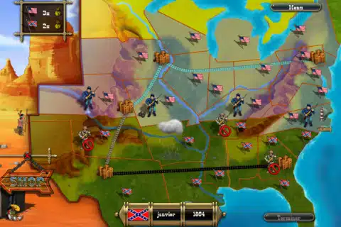 Die taktischen Züge seiner Truppen macht man auf der Landkarte von Amerika. Hier verlegt man rundenbasiert seine Einheiten von einem Bundesstaat in den nächsten, ähnlich wie beim Brettspiel Risiko. Einmal durchlaufene Bundesstaaten werden mit der eigenen Fahne markiert und gelten als erobert. Treffen zwei gegnerische Einheiten aufeinander kommt es zum Kampf – in Echtzeit. Neben den gegnerischen Amerikanern können euch auch noch Indianer oder Mexikaner das Leben schwer machen, die KI-generiert manchmal angreifen.