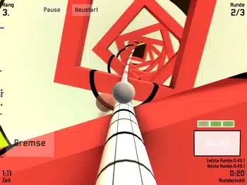 Klar, auch hier geht es mit einer Kugel fest verbunden auf einer lange Leitung durch die Spielwelten und man muss Hindernissen durch eine geschickte Drehung ausweichen. Doch erst die gravierenden Unterschiede zu den Kollegen machen aus dem Spiel ein längeres Vergnügen: Die Fahrt endet nämlich nicht schon beim ersten Hinderniss, an dass man aneckt, statt dessen bremst man nur ab. Hier gibt es auch feste Strecken. Und bei Proun+ gibt es Gegner, gegen die man antreten kann – so hat man hier also eine Art abstraktes Rennspiel mit jeweils 5 Kontrahenten vor sich.