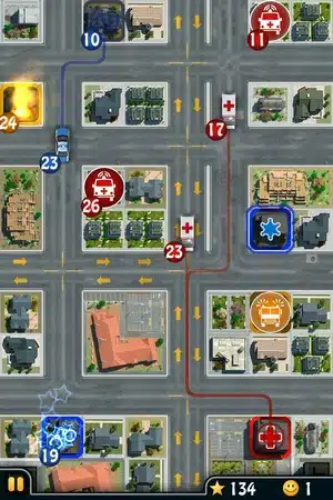 Anfänglich ist dieses Spiel sehr simpel und garantiert einen leichten Einstieg, wird aber zunehmend schwieriger. Zuerst kümmert man sich um Krankenwagen, die erscheinen auf der Stadtkarte und haben einen Countdown – bis dahin muß man ihnen den Weg ins Krankenhaus eingezeichnet haben. Danach koordiniert man die Feuerwehr, diese schickt man innerhalb der ablaufenden Zeit über die Straßen zum Feuer. Als drittes kommt noch die Polizei dazu, hier verhält es sich aber etwas anders: jeder Polizeiwagen hat ein Kontingent an Zeit, mit dem er auch mehrere Einsatzort anfahren kann. Er muß nur innerhalb seiner Zeit zurück zum Revier (die Kollegen brauchen wahrscheinlich dringend ihre Kaffee-Infusion mit Donut-Wechselverband 🙂