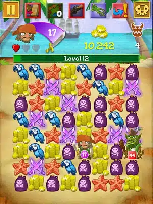 Das Spielbrett ist als Bühne gestaltet und wird in mehreren Reihen mit Requisiten wie Kokosnüssen, Säbeln, Fässer, Rumflaschen oder Gold vollgestellt. Mittendrin steht ihr und natürlich auch Gegner, die sich oft langsam, aber sicher zu euch vorarbeiten. In gewohnter Match3-Weise könnt ihr die Requisiten durch einfaches Verschieben zu mindestens drei gleichen Gegenständen kombinieren, wodurch sie von der Bühne verschwinden und euch gutgeschrieben werden.