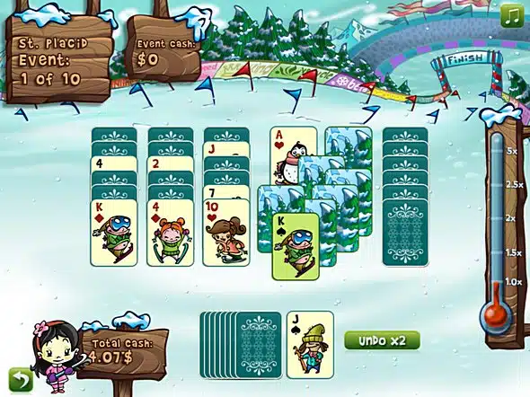 Bevor man bei Ski Solitaire so richtig loslegt, erstellt man ein Spielerprofil, wählt man seinen Charakter und beginnt in der Ski Akademie. Die anderen 9 Abfahrten muss man erst nach und nach freischalten. Auf der Piste angekommen, werden die Skifahrer auf dem Hang als Karten dargestellt – diese muss man nun ins Tal geleiten. Was in unserem Fall der Ablagestapel ist, clevere Umsetzung!