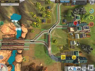 Hat man die erste Strecke verlegt, blinkt kurz danach auch schon ein Symbol im Bahnhof mit der Farbe der Ziel-Stadt. Mit einem einfachen Touch darauf schickt man den Zug in die Spur. Über jedem Zug wird der zu erwartetende Gewinn eingeblendet, der mit der Zeit immer mehr nach unten geht. Es ist also Eile geboten und der Zug sollte möglichst schnell losfahren. Das Geld ist auch bitte nötig, denn die Bauteile kosten Geld. Und will man eine zweigleisige Strecke bauen, kann man zwar mehr Züge fahren lassen, braucht aber deutlich mehr Geld.