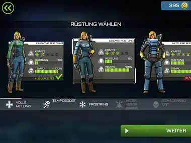 Xenowerk IAP Im Shop kann man für das gefundene Geld Waffen und Rüstungen kaufen. Waffen sind viele im Angebot und haben schicke Effekte. Zwei Stück kann man mit in eine Mission nehmen und sie dort mit den Waffen-PowerUps dauerhaft verbessern. Was genau besser wird, kann man aber nicht bestimmen. Schutz-Anzüge gibt es leider nur vier Stück, mit denen man gleichzeitig nützliche Superkräfte freischaltet: Ballert man genug auf Gegner, steigt ein PowerUp-Meter und man kann (mit dem entsprechenden Anzug) sich auf der Stelle heilen, schneller laufen, die Gegner einfrieren oder einen Schadensbonus anwenden.