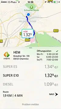 Die Navigation ist dann auch fester Bestandteil. Entweder der Spritradar zeigt gleich den Weg und die Entfernung zur gewünschte Tanke in der App an oder leitet die Suchanfrage direkt an eure normale Navigations-App wie die hauseigene Karte von Apple weiter. Wenn man eine Route eingibt, lassen sich entlang dieser auf kommende Tankstellen anzeigen.