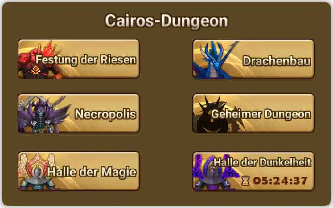 Ein Teil der verfügbaren Herausforderungen im Cairos-Dungeon. Beachtet die Halle der Dunkelheit als Beispiel eines täglich wechselndes Ereignisses.